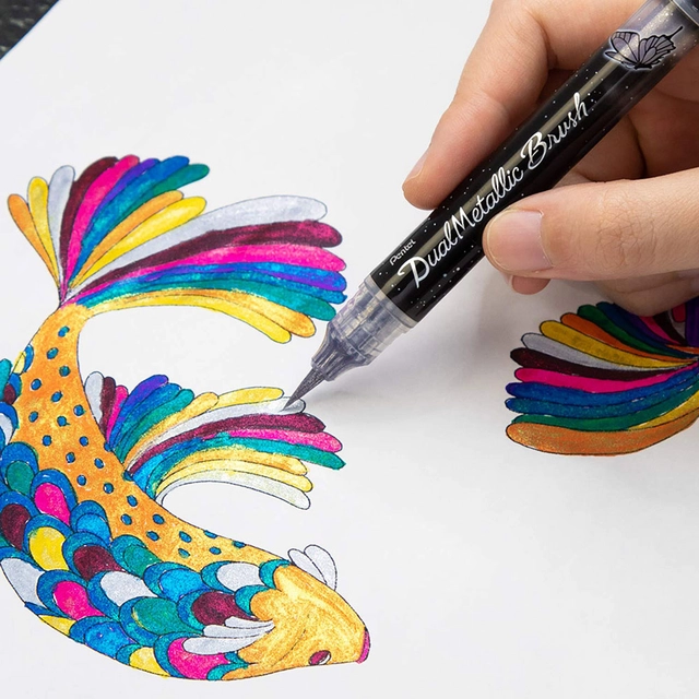 If you love adding a little sparkle to your artwork or notes, the Pentel Dual Metallic Brush Pen – Silver is your best companion. This pen shines with an iridescent glitter that is perfect for making your projects pop. This pen will help you stand out. The ink is metallic silver with a dual-tone effect that changes with the light. Your work will appear magical and unique.